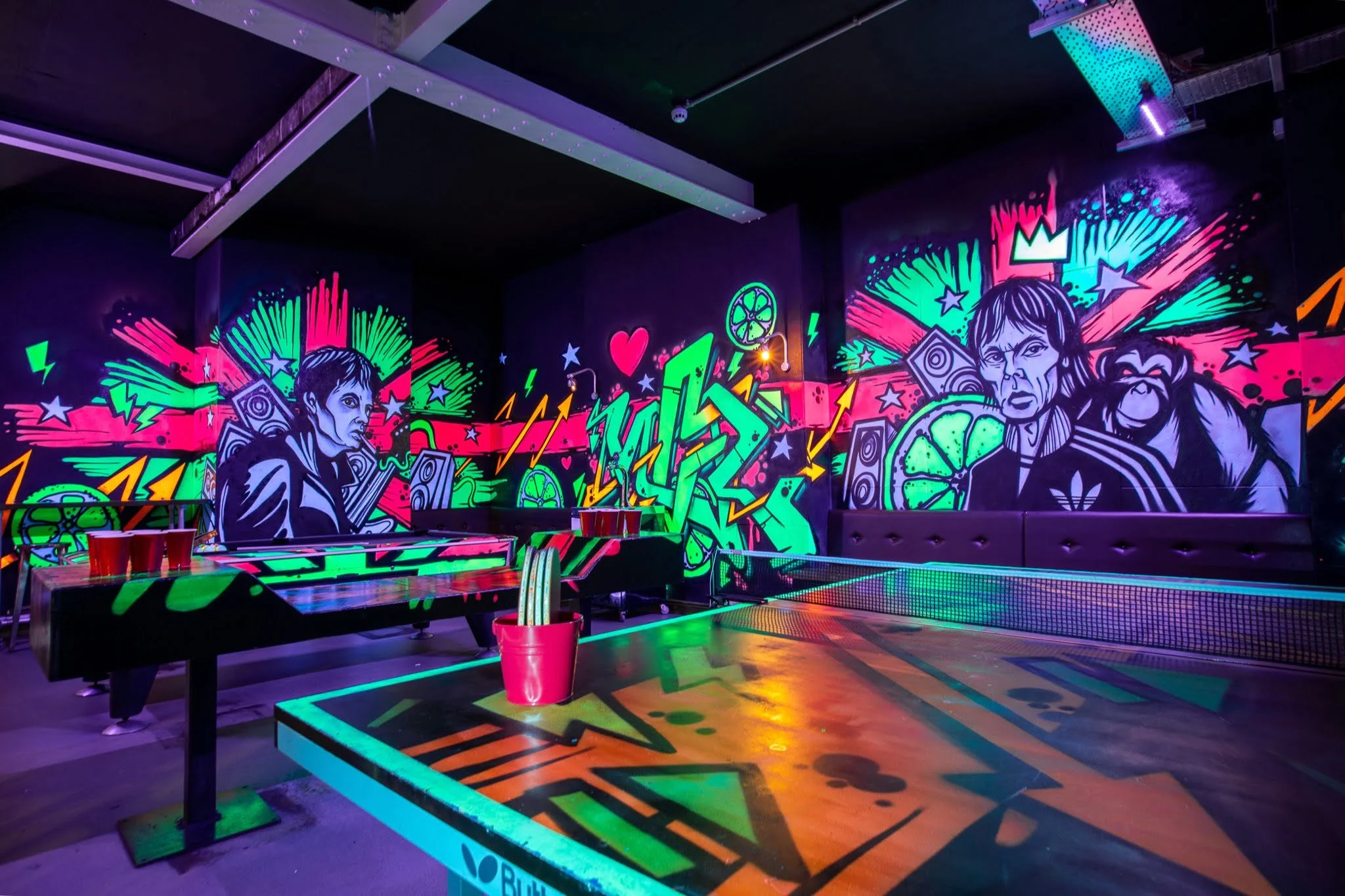 Neon-lit interiors and themed décor