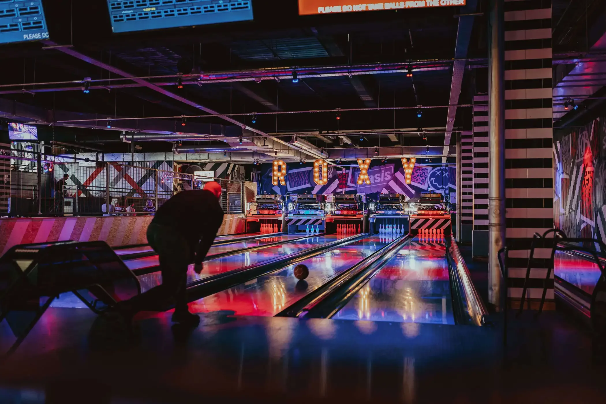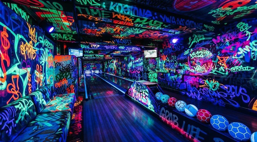 Bowling lanes with a nightclub-style atmosphere