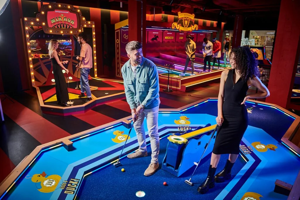 Junkyard Golf is one of Manchester’s most well-known activity venues, blending crazy golf, cocktails, and nightlife energy into one experience.